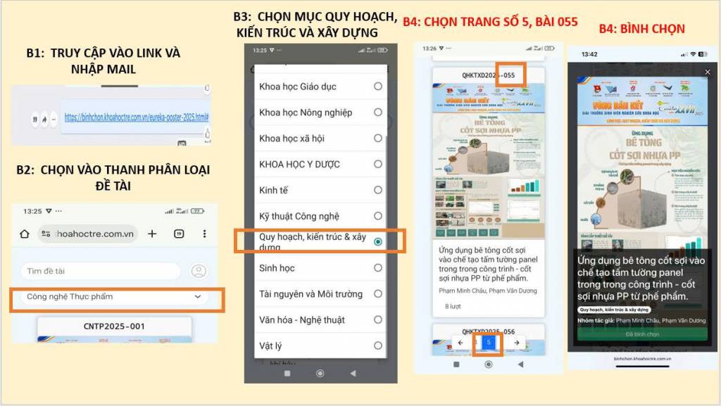 để bình chọn cho đề tài ỨNG DỤNG BÊ TÔNG CỐT SỢI VÀO CHẾ TẠO TẤM TƯỜNG PANEL TRONG CÔNG TRÌNH - CỐT SỢI NHỰA PP TỪ PHẾ PHẨM, được hướng dẫn bởi thầy Phan Thế Vinh, theo hướng dẫn trong hình bên dưới: